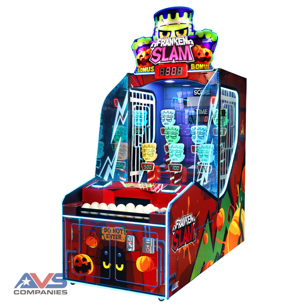 Franken Slam is a thrilling ball-toss redemption game where players race against time to knock down glowing Frankenstein heads. Each color target—green, blue and orange—awards different points. Hit the bonus score to win extra tickets! Fast-paced, fun and skill-based, it’s a monster hit for any arcade or FEC.