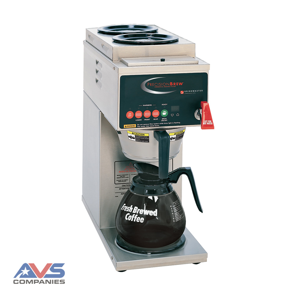 The Grindmaster PrecisionBrew™ B-3 is a digitally controlled coffee maker system. This high-quality coffee maker regulates the brew temperature and brew volumes through digital controls for complete accuracy and satisfaction. The Grindmaster PrecisionBrew™ B-3 maintains the water temperature at +-1°F throughout the brew cycle. Pre-Infusion and other programmable brew process controls allow the operator to achieve a signature cup: to their exact brew process specification and taste profile. This electric coffee brewer also includes a feature called Low Temp-No Brew, which prevents brewing with water that has not reached optimum brewing temperature. The Grindmaster Model B-3 is a single, digitally-controlled decanter brewer. It has one warmer under the brew basket and two warmers on top.