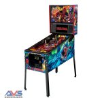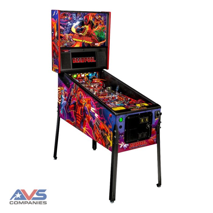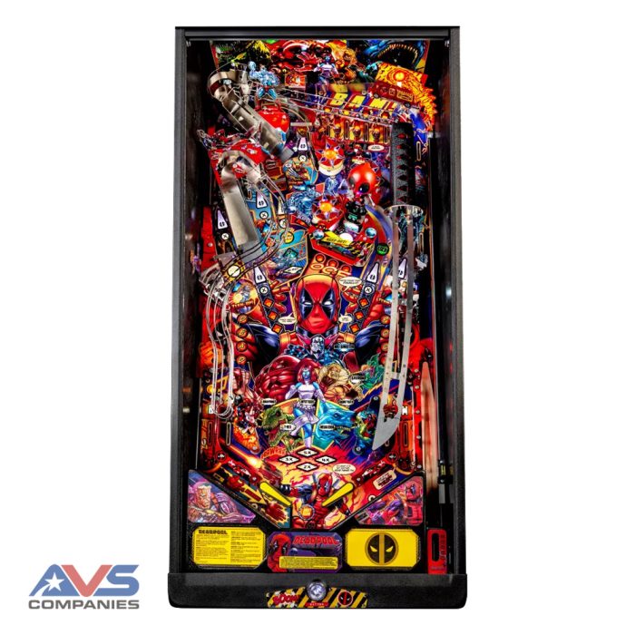 Stern’s Deadpool Pro, Premium, and Limited Edition models feature stunning and distinctive hand-drawn art by renowned illustrator Zombie Yeti. Well known actor Nolan North stars as the eccentric voice of Deadpool. Each game features a 3-bank drop target with a ball lock that’s guarding a custom molded Lil’ Deadpool bash toy target. In addition, all models include two stainless steel and wireform ramps with a Katana Sword ramp return. Deadpool pinball entertains with an amazing array of ninjas, vampires, and chimichangas, making it suitable for all skill levels.