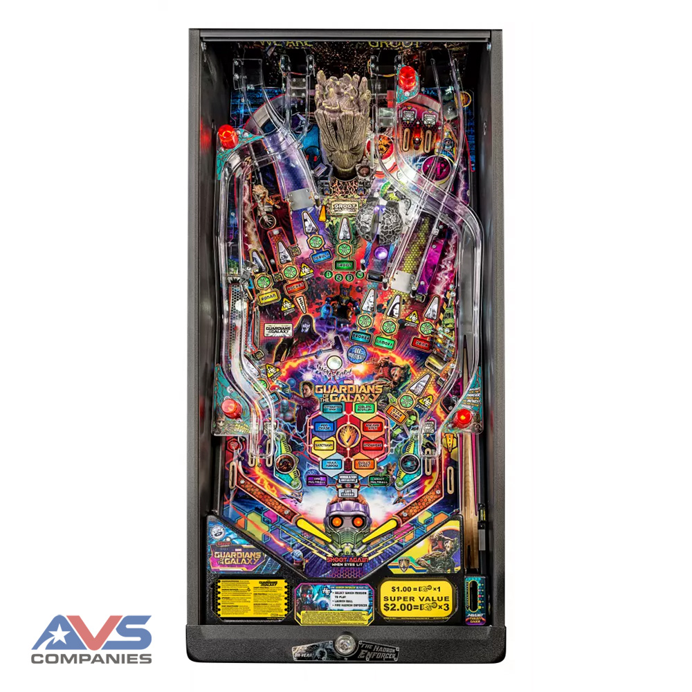 Stern’s Guardians of the Galaxy Pro, Premium, and Limited Edition models are packed with features that provide an irresistible gameplay experience. Each game features a sculpted and interactive ball-eating Groot. In addition, a custom sculpted Rocket figure will keep players on their toes as it blasts the ball back at rocket speed. Color-changing inserts highlight the mysterious and interactive Orb, which opens to reveal the powerful Infinity Stone. The Limited Edition and Premium models also feature extra magnets, custom artwork, RGB lighting, and sculpted Groot arms that sprawl across the playfield.