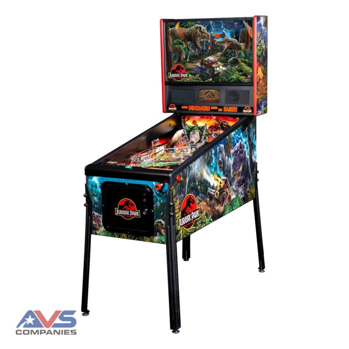 Jurassic Park Home Edition brings to life the most fearsome predator ever to walk the earth with an interactive, custom sculpted T. rex. Players will battle against the Spinosaurus by bashing a captive ball and corral Raptors in their enclosed pen with precision shooting. Fast flowing metal ramps, lightning quick spinners, and kinetically satisfying physical drop targets will provide players with an adrenalized game experience packed with unmatched action and fun. The all-LED playfield lighting provides dazzling light shows in sync with the iconic Jurassic Park theme music to create an immersive pinball experience.